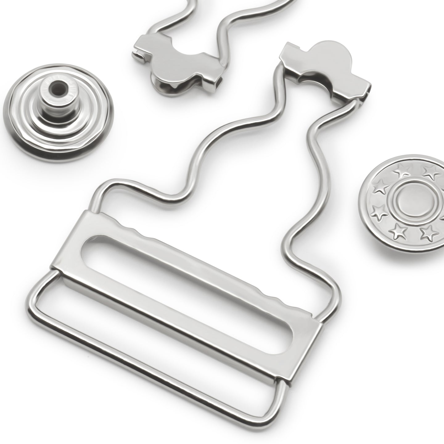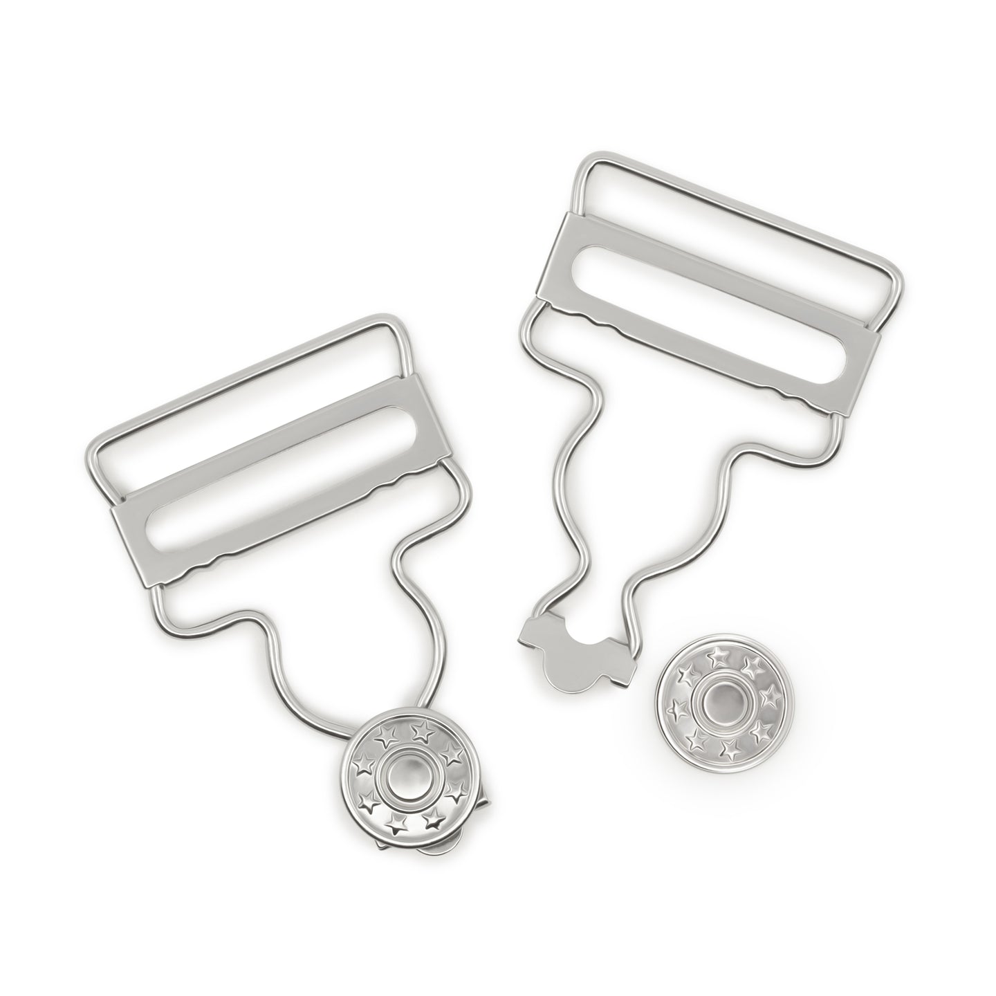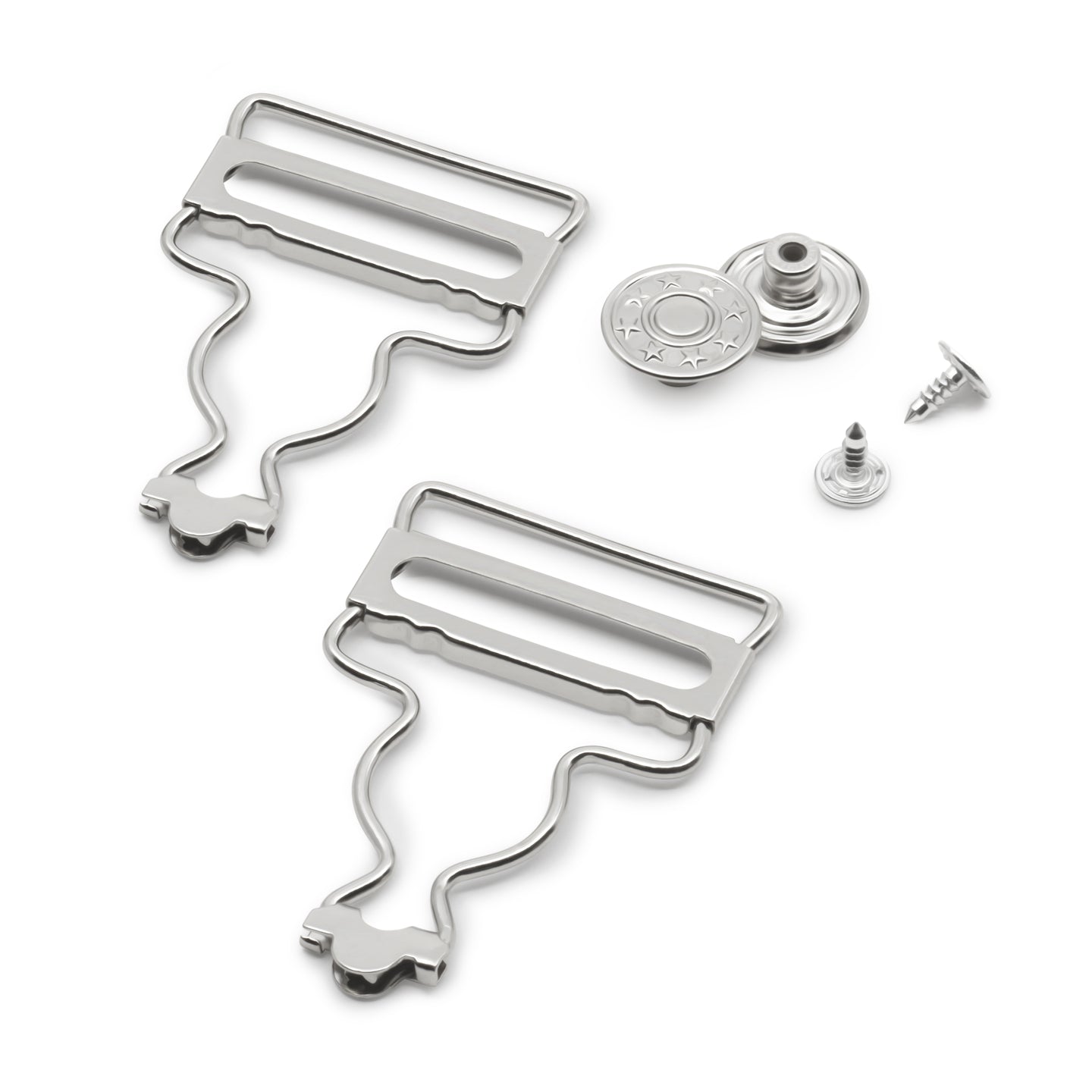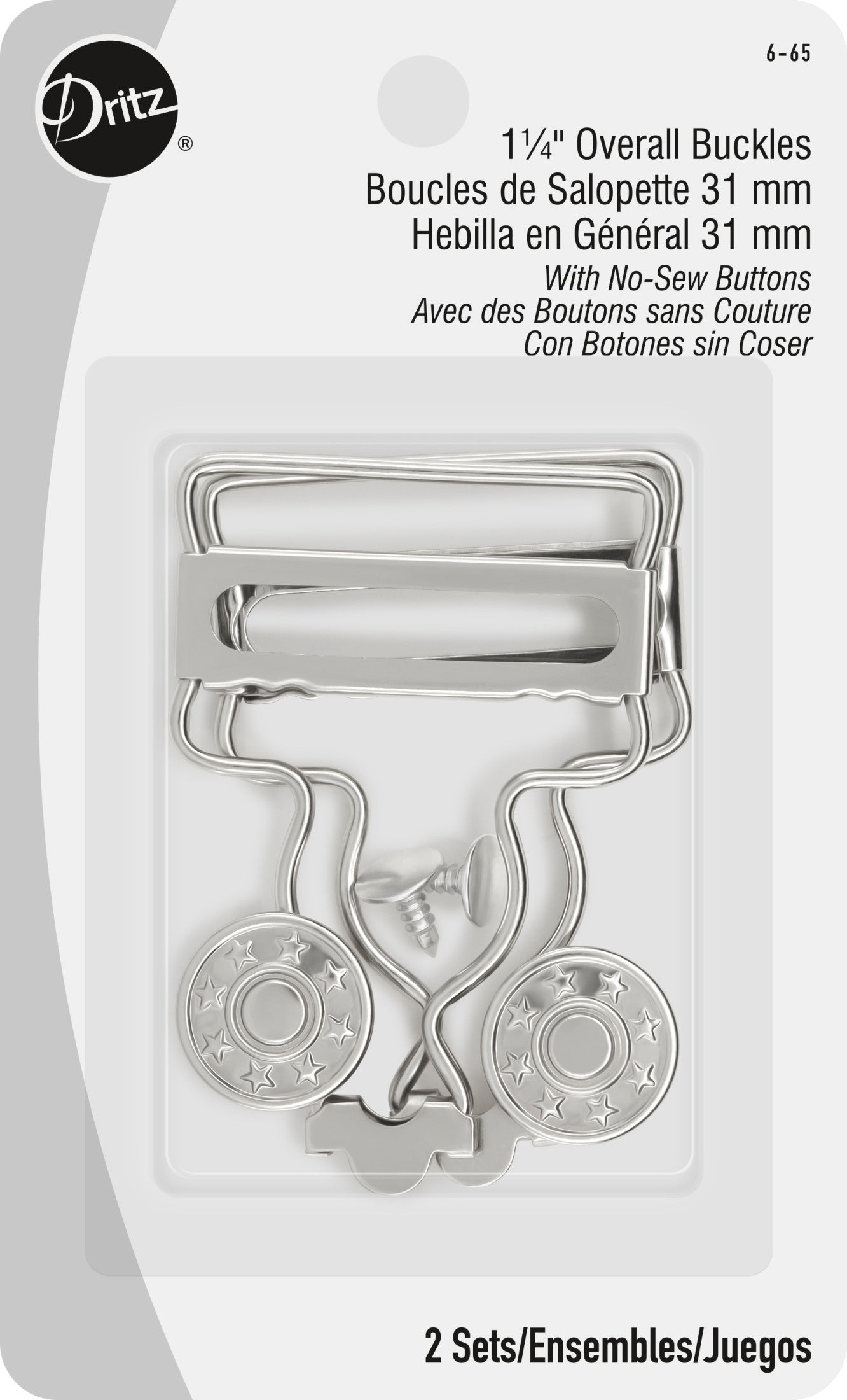 Dritz overall buckles with no-sew buttons are ideal fasteners for both apparel and accessories. Use for DIY sewing projects as well as repairing, replacing or adding buckles to store-bought garments. This package contains 2 no sew buttons and 2 buckles for 1-1/4" wide straps in nickel finish.