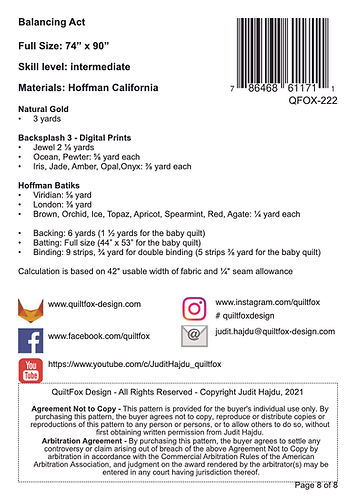 Balancing Act is a full-size quilt measuring 74" x 90" that showcases the vibrant Backsplash 3 digital print fabric line paired with coordinating batiks. Its design uses simple geometric shapes and bold colors to achieve a harmonious visual balance. The straightforward piecing technique not only simplifies construction but also generates enough fabric scraps to effortlessly create a complementary 40" x 50" baby quilt. This quilt offers both striking aesthetics and practical sewing efficiency for experienced quilters.