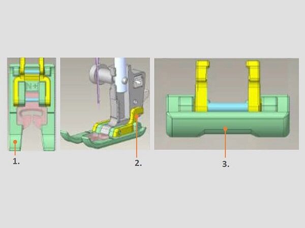 - Foot guide Plastic guide on the foot to minimize misalignment when sewing