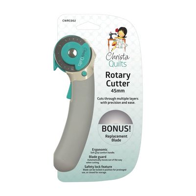 The Christa Watson Rotary Cutter 45mm Soft Touch offers expert quilters a precise and comfortable cutting experience. Featuring an ergonomic handle designed for extended use, it includes a blade guard and safety lock to ensure secure handling. Created by Christa Watson, a respected machine quilting author and educator, this cutter combines professional design with reliable safety features for accurate, effortless fabric cutting.