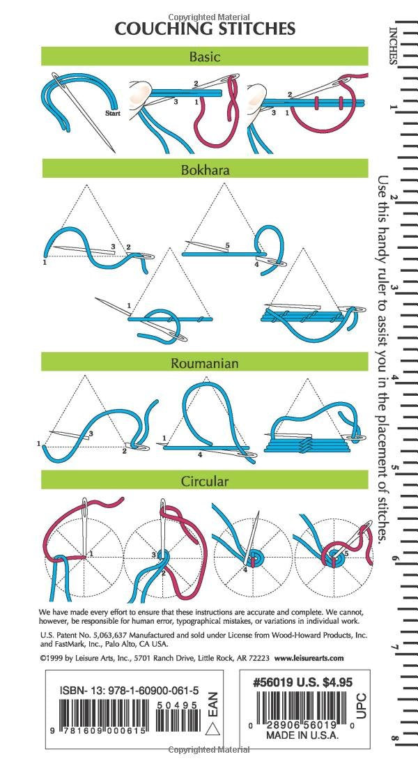 Embroidery Pocket Guide is the handiest reference guide for embroiders ever -- a laminated pocket-size encyclopedia of the most popular stitches and much more. Approximately 8.5 inches tall by 4.625 inches wide, the guide folds out accordion-style with information on supplies and stitching tips, plus illustrated stitch guides. Featured stitches are backstitches, blanket stitches, chain stitches, couching stitches, cross stitches, featherstitches, filling stitches, running stitches, satin stitches, and weaving stitches. A ruler is printed along the edge for convenience.