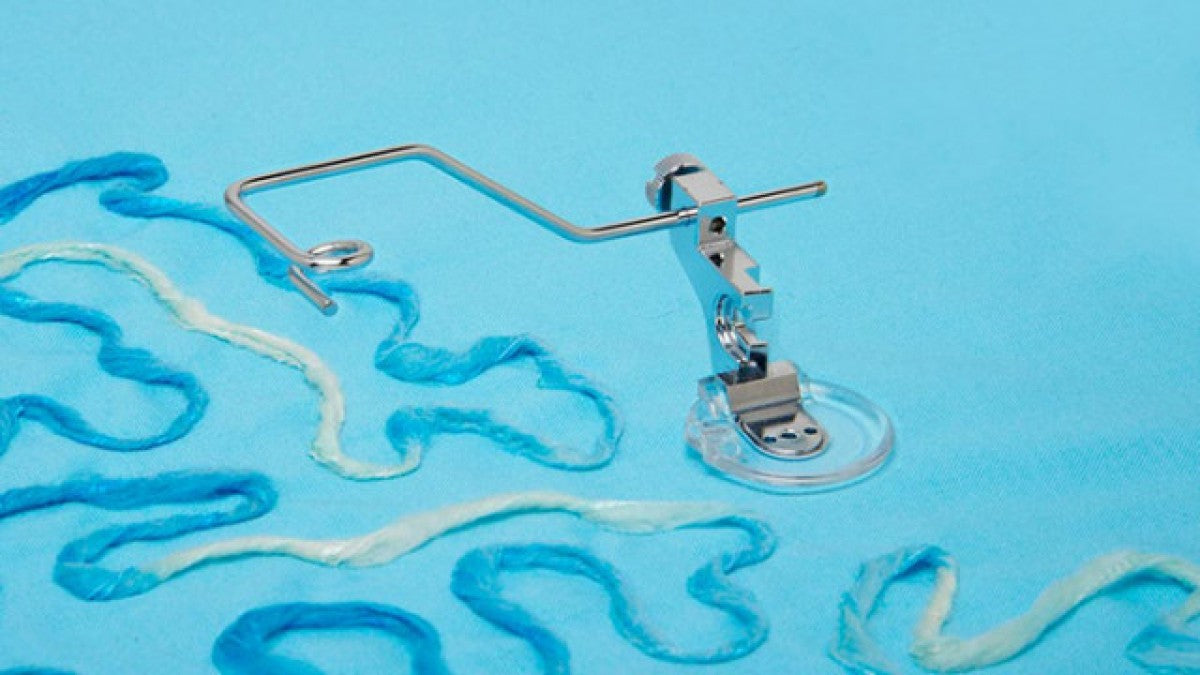 Easily embellish projects with decorative yarns using the Baby Lock Couching Foot. The guides hold your yarn giving your hands more control for free-motion sewing.