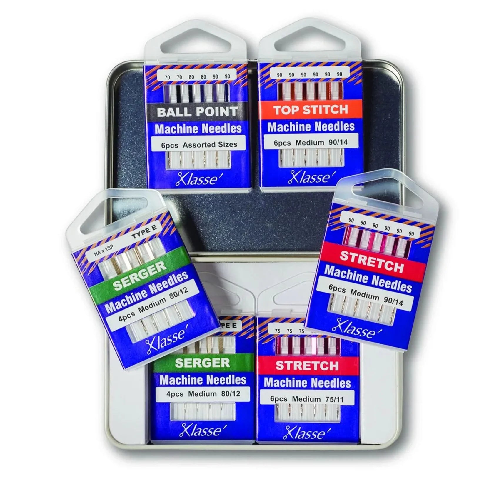 This Klasse Serger Needle Set includes the essential serger needles. This kit contains five different needle options and also has a QR code for an instructional video about when to exchange your needles. The video also explains how to change your needle, the uses of each needle, and more! Included in this kit are Klasse Serger 80/12, Stretch 75/11, Stretch 90/14, and Ballpoint. The Ballpoint needles are an assortment of (2) 70/10, (2) 80/12, (2) 90/14.