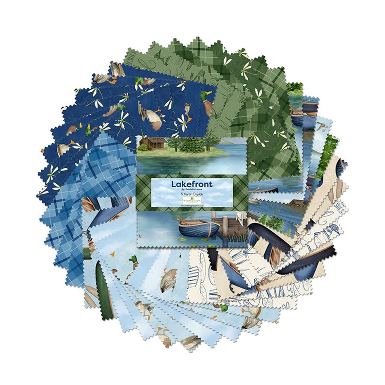 Wilmington Prints Fabrics Lakefront Danielle Leone 5 Inch Squares 5 Karat Crystals. Lakefront by Danielle Leone for Wilmington Prints features lake house vacation quilting fabrics by the yard, quilt panels, charm squares, layer cakes, fabric strips, free quilt patterns, and quilt kits
