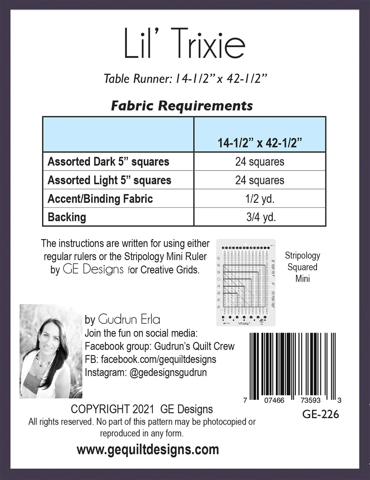 Lil' Trixie comes together quickly and simply with the Stripology Squared Mini Ruler, light and dark 5" fabric squares, and an accent fabric. Full color instructions include how to use regular rulers as well. Size 14-1/2" x 42-1/2"