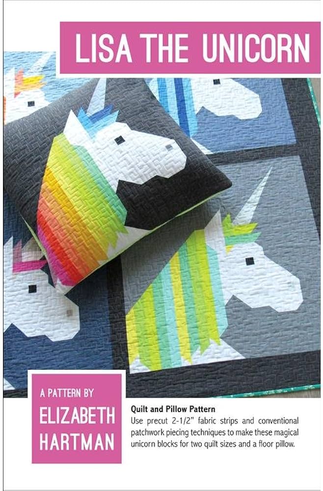 Lisa the Unicorn includes instructions for two quilt sizes and a quilted pillow cover featuring 26" x 26" patchwork unicorn blocks. All fabric is rotary cut and sewn together using conventional patchwork piecing. The unicorns' horns are created using the included cutting guide.