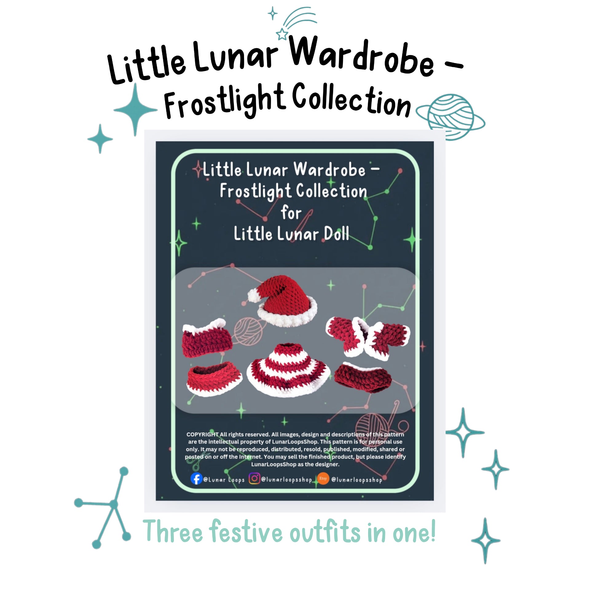 Create three festive, mix-and-match outfits for your Little Lunar Doll with the Little Lunar Wardrobe - Frostlight Collection. This seasonal mini-collection contains three outfits designed to pair perfectly with the Little Lunar Doll Base. Cozy, quick to stitch, and full of cheerful holiday charm.