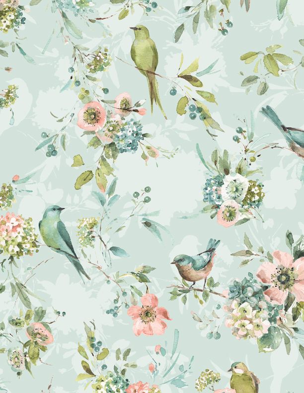 Bunches of spring flowers with the occasional songbird. Mint Crush by Wilmington Prints is the soft floral group of your dreams.