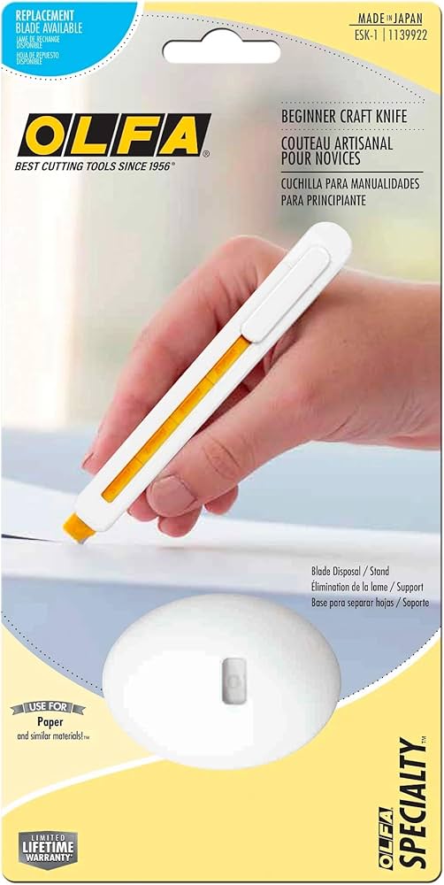 Designed for crafters of all ages, meet the new ESK-1 Beginner Craft Knife. This knife combines high-quality, precision cutting in an easy-to-use handle. The patented design encases each blade segment within plastic to limited blade exposure. This unique design offers safer and more confident cutting for any user.The Beginner Craft Knife utilizes OLFA snap technology packing four-blade segments in one. Simply snap the segment to reveal a new tip. The included stand functions as both the blade snapper as well as a blade disposal container to safely snap and store used blades.Includes knife, one blade, and blade disposal/stand.For right- and left-handed use. Safe design limits blade exposure. Each blade segment is covered in plastic for increased safety.