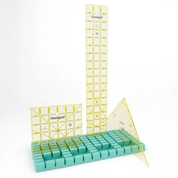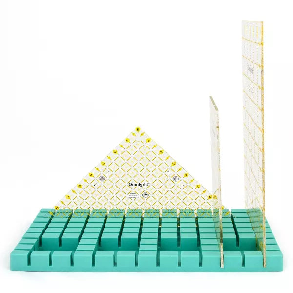 Our new OmniRack offers an attractive, space-conscious way to keep your favorite Omnigrid rulers visible, upright and close at hand. The sturdy construction features a non-slip base and the integrated "catch-all" compartments will keep all of your sewing notions and small tools in one place. Size: 13-5/8" x 5-5/8" x 7/8"