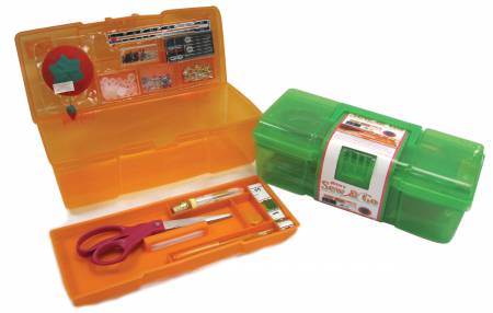 Great starter kit or travel kit comes in a plastic case with removable tray. Sewing Kit Contents: Pincushion, Straight Pins, Needle Compact, 8.5in Scissors, Needle Compact, Needle Threader, Pre-Threaded Needles, Thimble, Tape Measure, Seam Ripper, Sewing Gauge, Assorted Safety Pins, Assorted Size Buttons, and Hook & Eyes. Removable Tray.