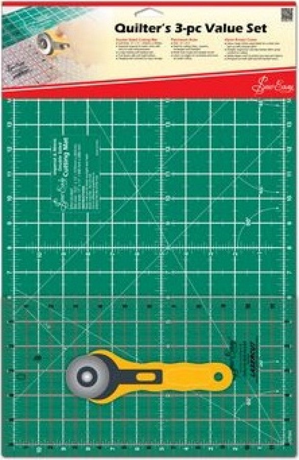 Quilting Set Includes: 12" x 18" Cutting Mat, 12" x 6" Rotary Cutting Ruler, & 45mm Rotary Cutter.