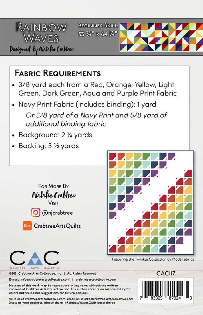 Rainbow Waves by Natalie Crabtree for Gingiber offers a vibrant beginner-friendly quilt pattern featuring bright fabrics in rainbow hues. Designed with precision, this 53 3/4" x 64 1/4" quilt combines simplicity and striking color waves, making it an ideal project for those new to quilting who want a polished, colorful result.