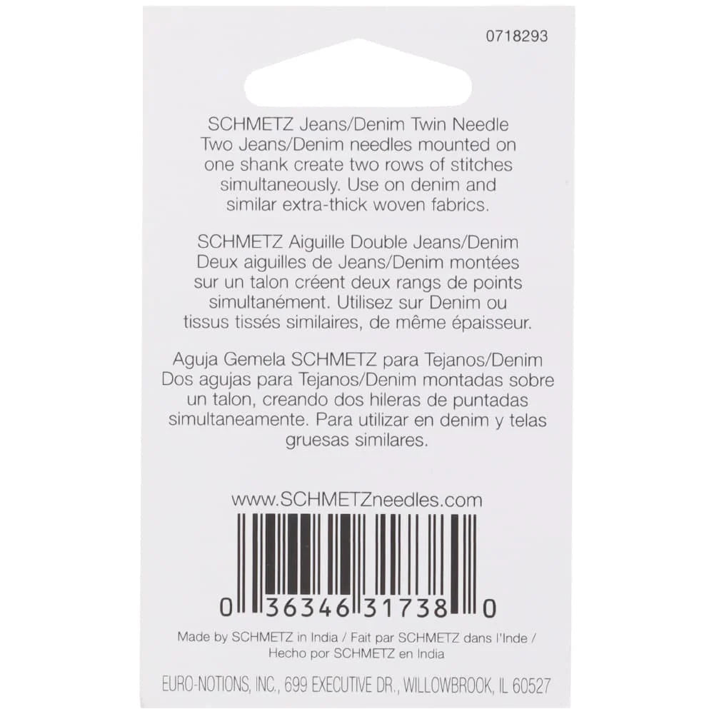 Also called Jeans Twin Needle. Perfect for sewing double rows at the same time on extra thick woven fabrics. The medium ball pont and reinforced blade cause less deflection of the needle and reduces the risk of needle breakage and skipped stitches. System: 130/705 H-J ZWI. Size: 4.0/100 (4mm distance between needles, needle size 16/100) 1-pack. Carded.