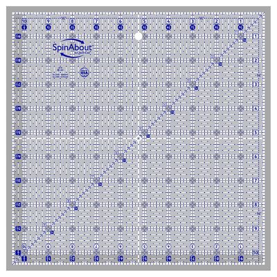 The SpinAbout 10.5 in Square Ruler is a USA-made essential for precise quilting. Featuring non-slip surfaces and clear blue and white translucent markings, it ensures accuracy on both light and dark fabrics. Its unique SpinAbout feature lets you rotate the ruler 180°, making it simple to add a ½ inch seam allowance. With invisible line windows for perfect fabric alignment, 45° diagonal guides, and dual-direction 1/8 inch scales for right or left-handed use, this ruler streamlines squaring up blocks and trimming half squares with ease. Size: 10½" x 10½".
