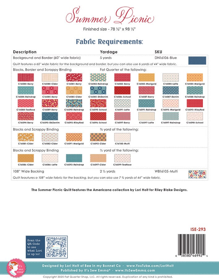 The Summer Picnic Quilt Pattern by Lori Holt of Bee in My Bonnet brings a splash of joy to your outdoor adventures. Featuring charming star blocks set against a soothing blue background, this quilt captures the magic of a summer sky. Perfectly sized at 78.5" x 98.5", it’s your ideal companion for lakeside lounging, park picnics, or porch chilling. Cozy up, watch the fireworks, and let this scrappy, cheerful quilt brighten your sunny days.